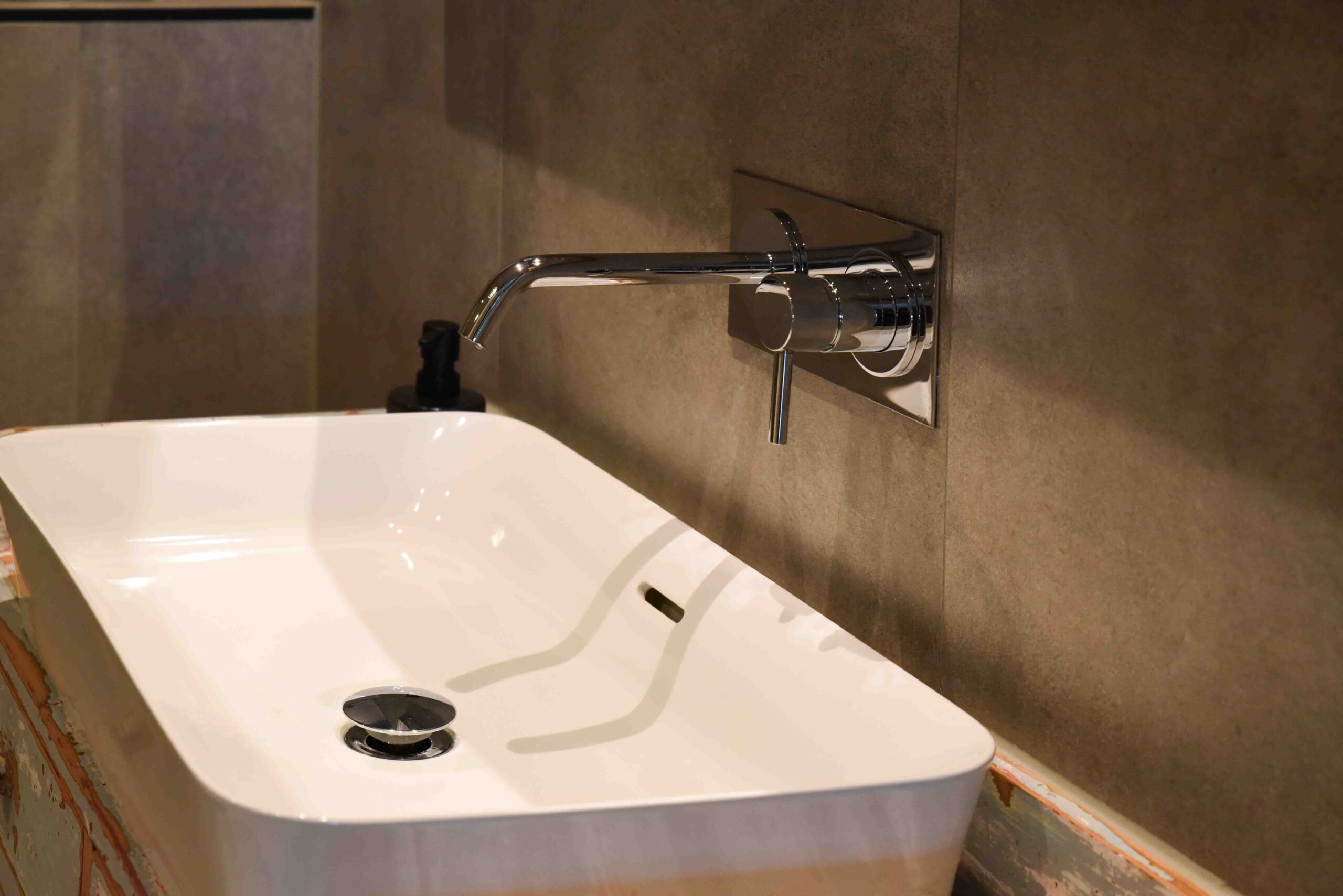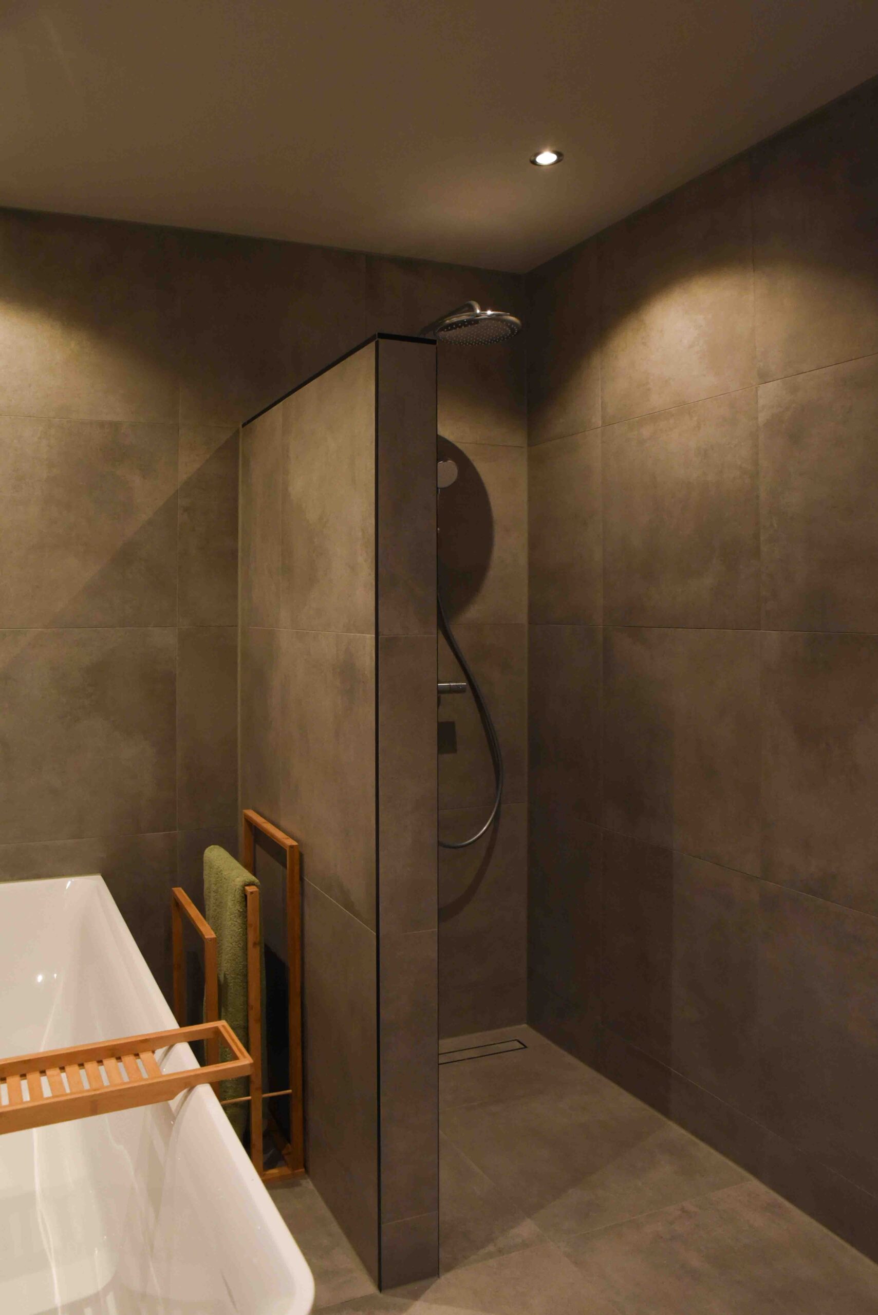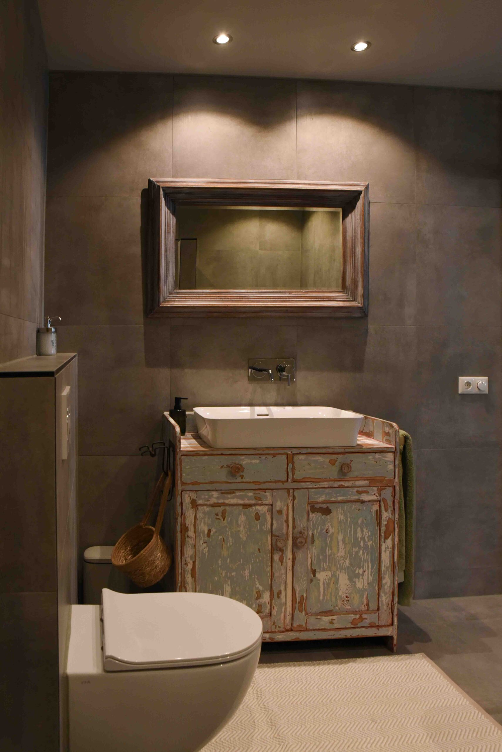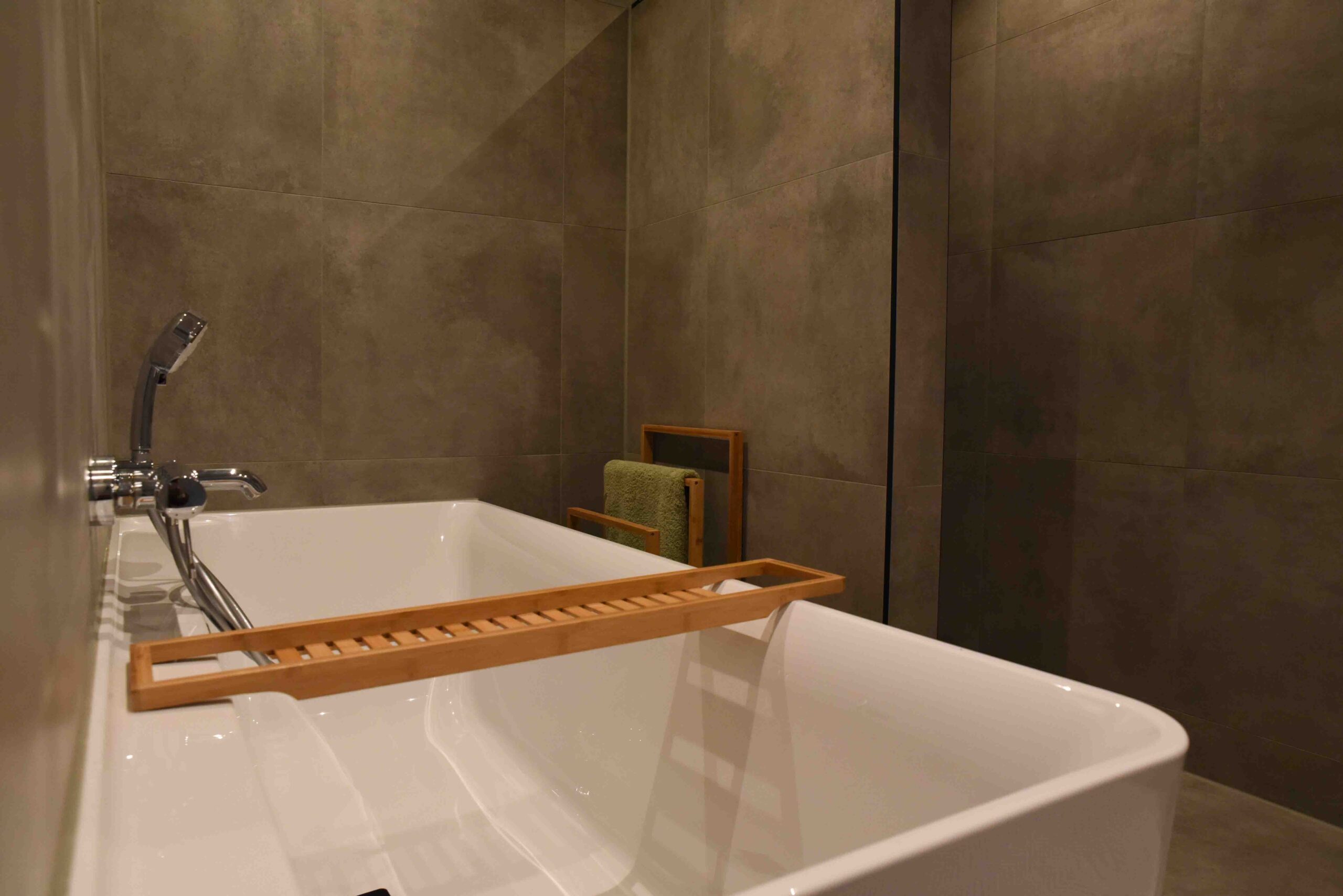 De complete badkamer is voorzien van een douche, ligbad, wastafel en toilet.